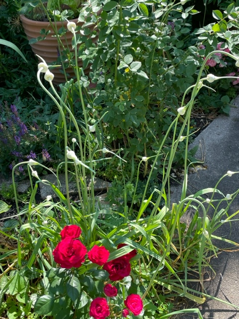 Roses and garlic scapes (flower buds of hardneck garlic) are neighbors in my garden. Each has a distinctive scent. However, both combine their talents of beauty and whimsy in flower bouquets. Cutting-back is helpful, as both thrive best when pruned. Garlic scapes are tasty and by cutting back the scapes, the buried garlic bulb grows larger. Similarly, it is through pruning that future roses increase growing power.