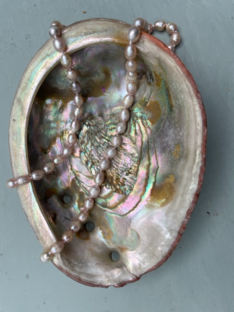 Pearls exude strength. Pearls may look peaceful, but it must be challenging to be peaceful amidst immigrant upbringing. A natural pearl is born in trauma, in a disturbance to the parent oyster, mussel, or clam shell. When a foreign irritant, perhaps a parasite, lodges itself into the lining of the mollusk shell, a sac covers the invader and a fluid called nacre coats the intruding irritant. It is the layering of this protective mother-of-pearl (or shell material called nacre) that forms pearls. Nacre is made from a mineral, aragonite; how marine invertebrates secrete aragonite is a mystery.